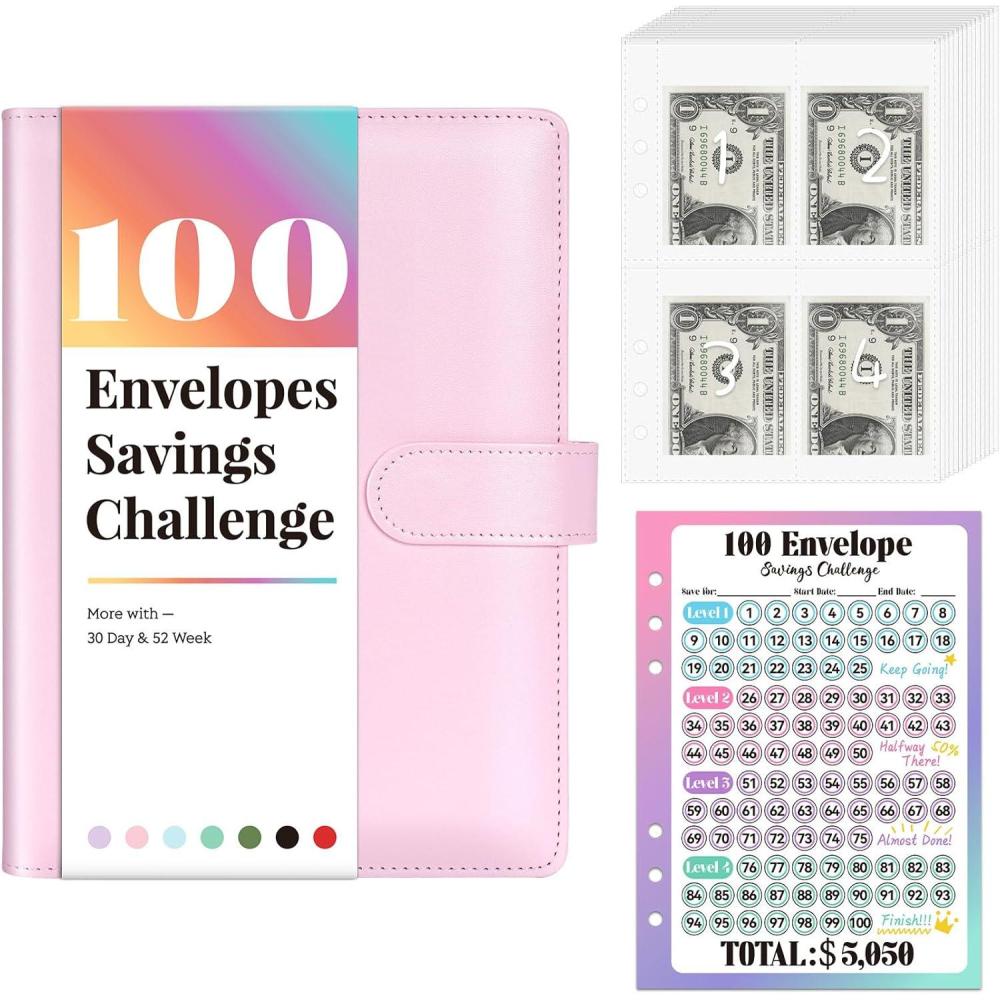Money Savings Challenge Kit: 1 A5 PU leather binder, savings tracker for marking, and 25 transparent cash envelopes pre-numbered with 1 to 100. Sooez money saving binder helps you build up an emergency savings fund and cultivates a saving habit throughout the save money challenge.