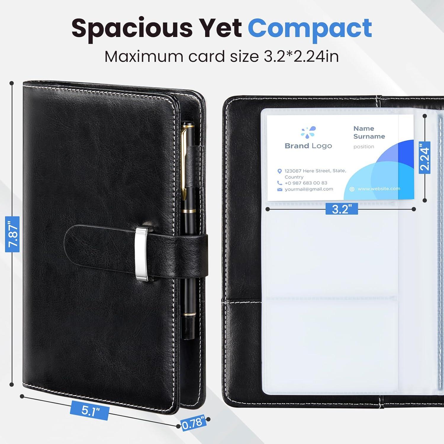 Large 300-Card Capacity: Holds 300 business cards back-to-back or 150 credit cards. Accommodate standard 3″×2.16″ cards with perfect fit. Features 2 interior pockets for cash, notes, IDs, and so on. A built-in pen loop keeps your go-to pen always at hand.