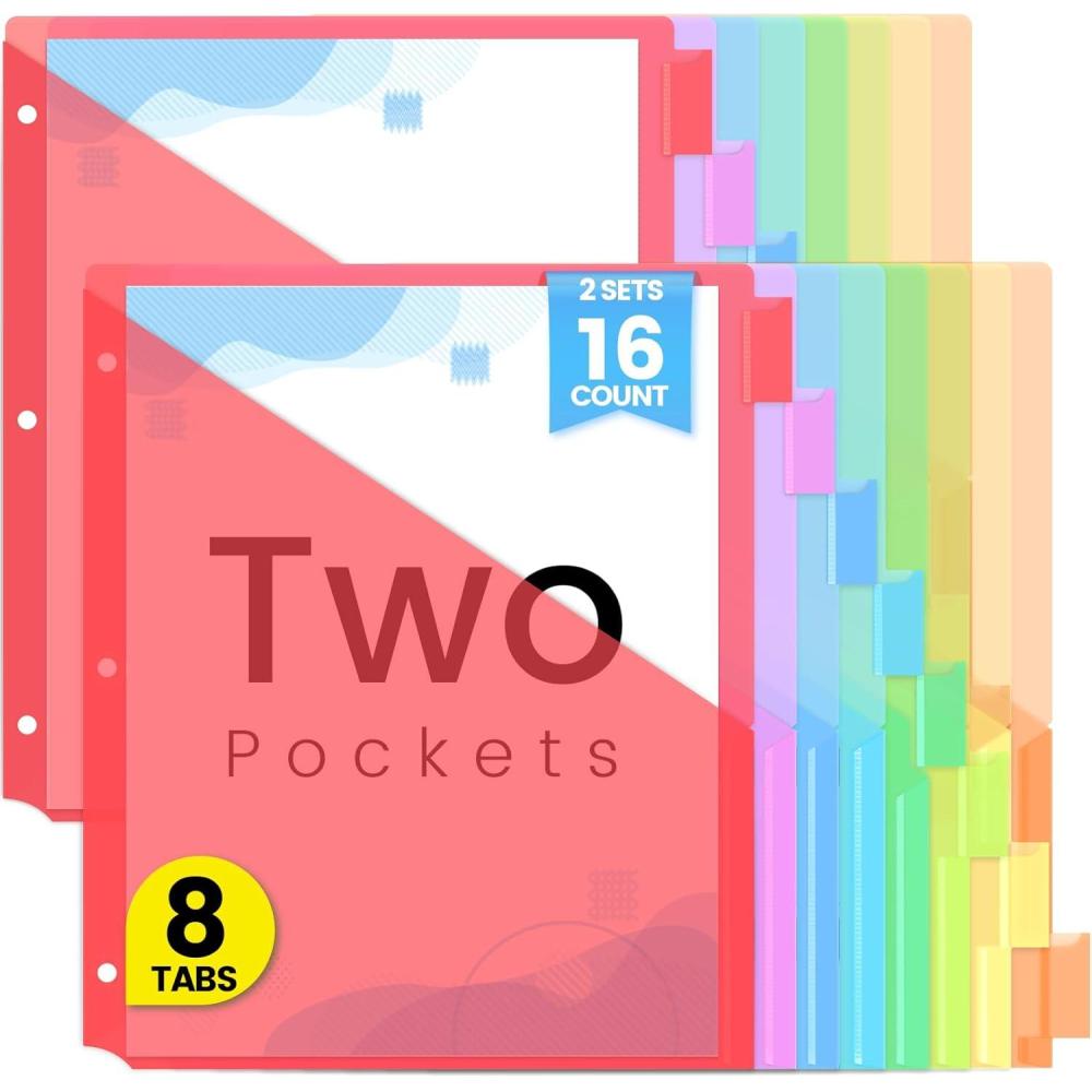 Sooez 8 Count Dividers with Two Pockets, Binder Dividers with tabs, 8 Tabs Binder Dividers for 3 Ring Binders, Binder Divider with Pockets for School, Office, Home Organizers, Multicolor, 1 Set(2 Sets)