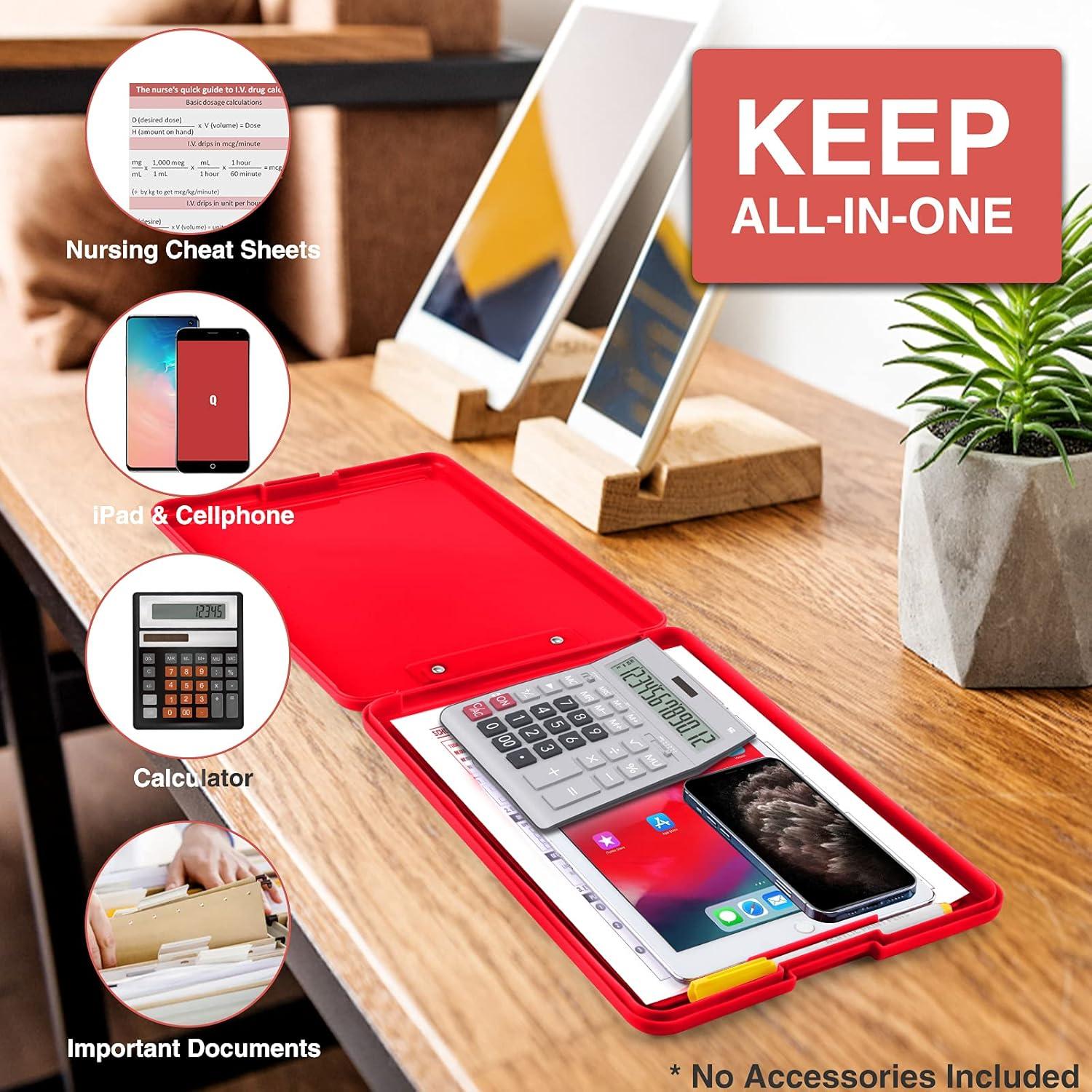 Clip Boards 8.5×11 with Storage-Meet your mobile desk! This durable, all-in-one storage clipboard securely holds 150 sheets & gear with a snap closure. The sleek, cleanable case features a handy hanging hole and a smooth writing surface. Perfect for keeping professionals, students, and creatives organized and efficient on-the-go. Your essential tool for work in the field, clinic, or cafe.
