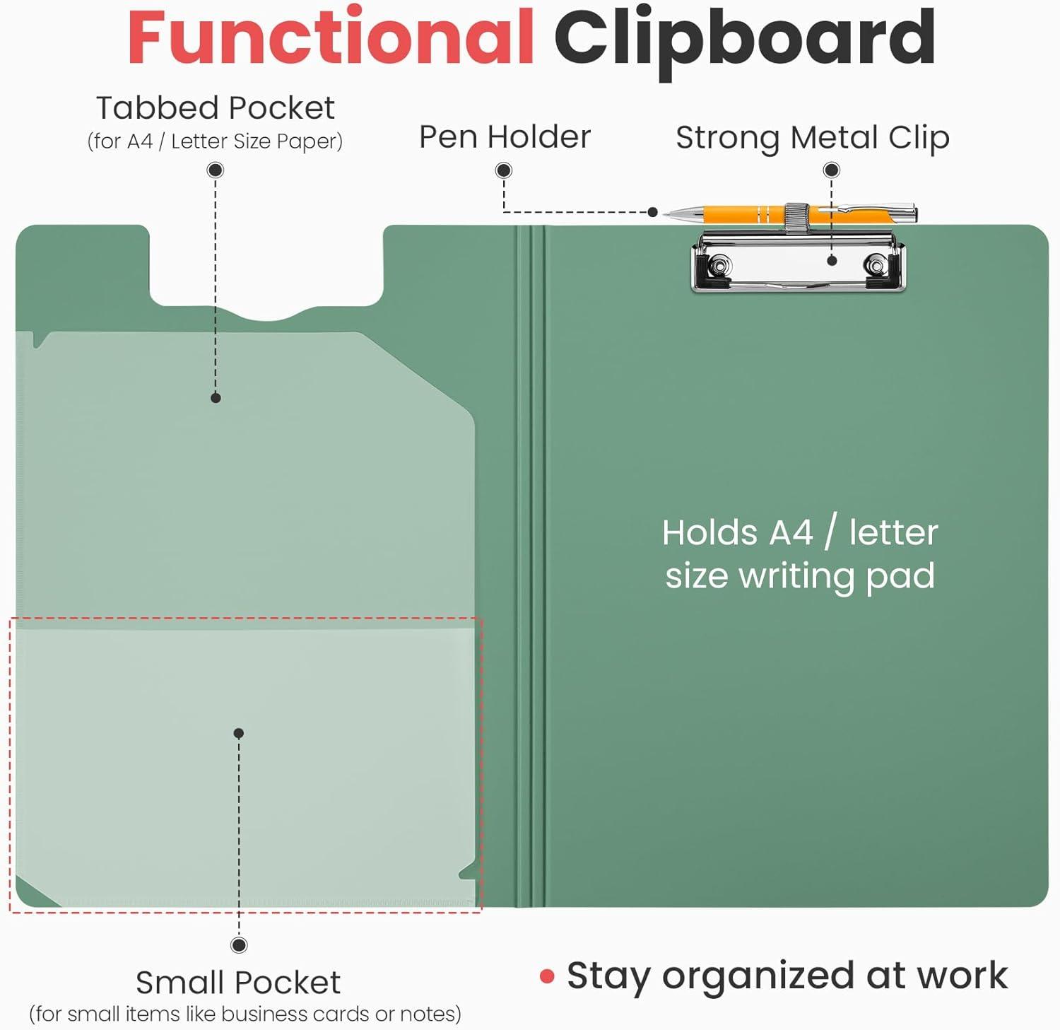 Tabbed Pockets & Low Profile Clip: Includes one tabbed pocket on the left for separating temporary files, documents, and a small pocket for business cards or small notes. Equipped with a robust metal low profile clip, it firmly holds 100 letter size / A4 size pages / legal pads, keeping documents neatly organized and firmly in place