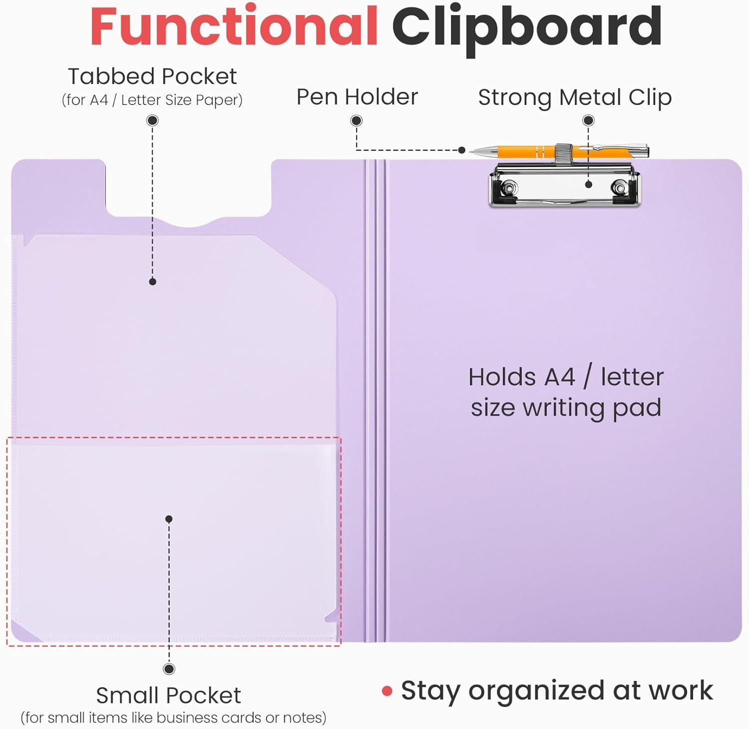 Tabbed Pockets & Low Profile Clip: Includes one tabbed pocket on the left for separating temporary files, documents, and a small pocket for business cards or small notes. Equipped with a robust metal low profile clip, it firmly holds 100 letter size / A4 size pages / legal pads, keeping documents neatly organized and firmly in place